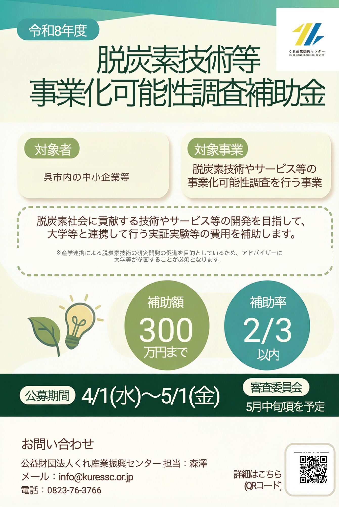 呉市における産学連携による脱炭素技術の研究開発を促進していくため、呉市内の中小企業等が行う脱炭素技術やサービス等の事業化可能性調査を行うものについて、当該年度内に事業を開始し、かつ完了するものです。